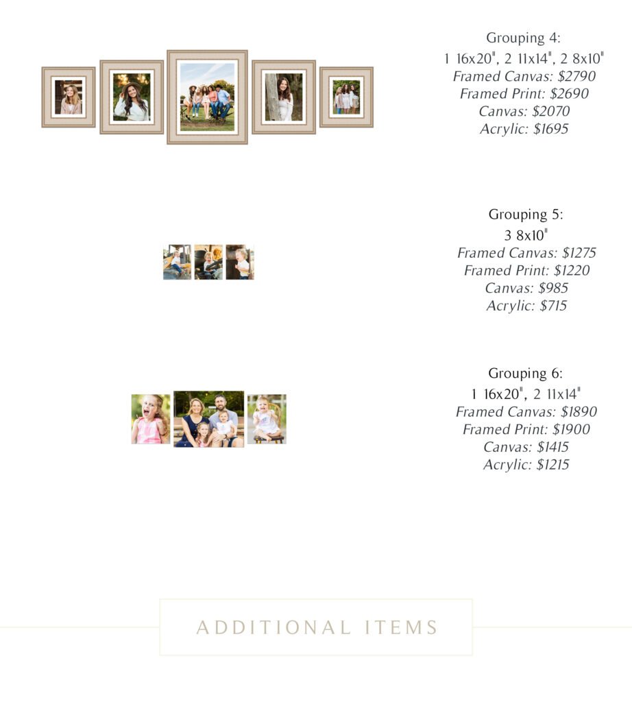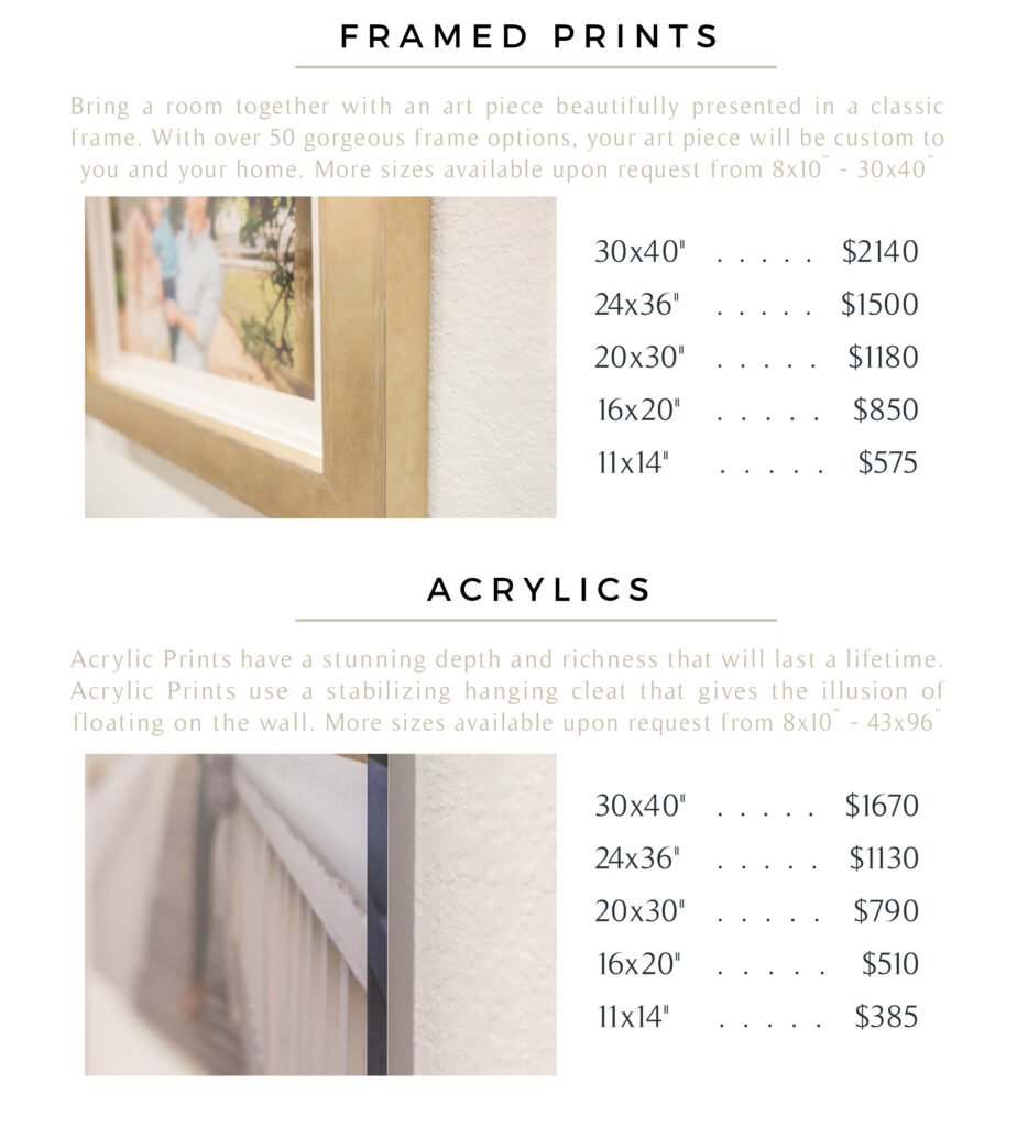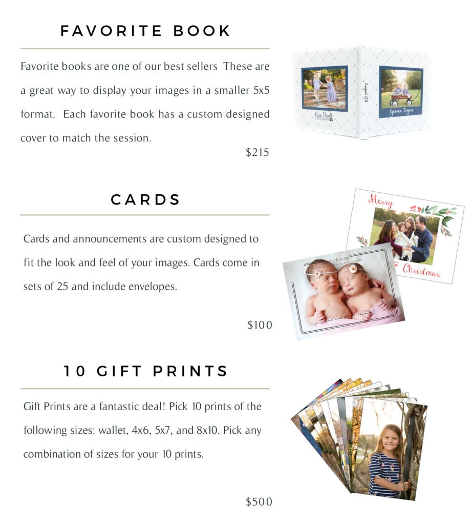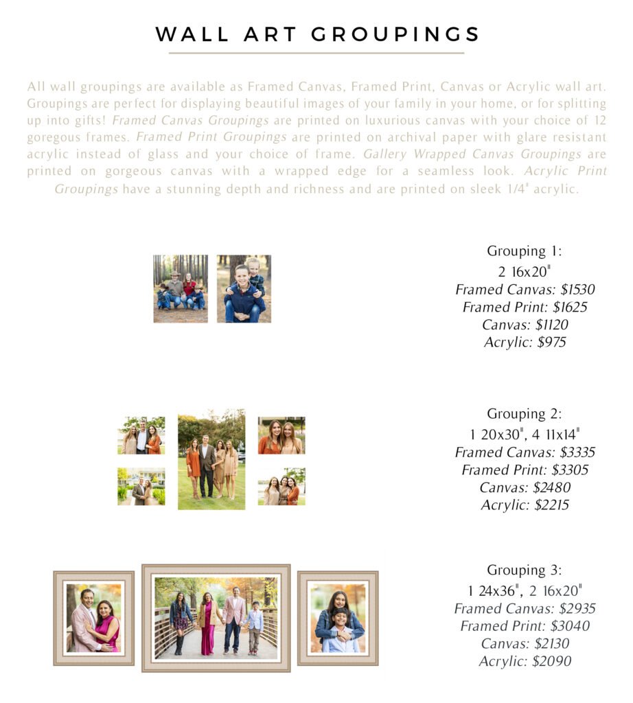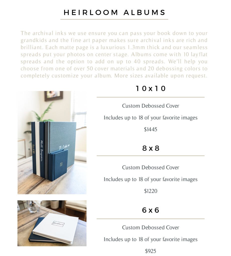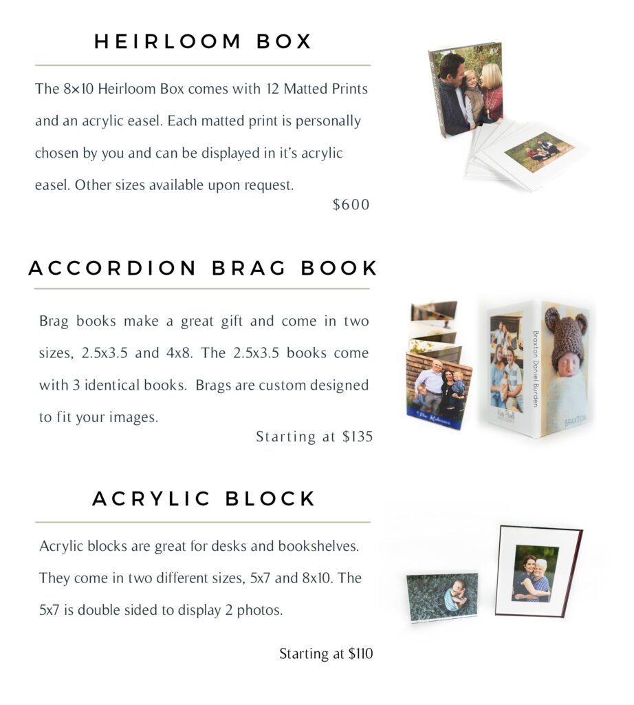 My focus is on creating fine art items with your beautiful images that you can see and enjoy every day. The benefits of printed products are endless and the joy of seeing your images everyday is immeasurable! Each of the products below is totally customizable to your family. Whether that is album design, wall art layouts or personalized wall art, each item will be made to fit the exact need you have. If you have any questions please feel free to contact me!